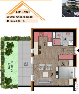 A hirdetésben szereplő L1. típusú, földszinti  lakás 38,30 m2 + 11,15 m2 terasszal, 12,39 m2-es kizárólagos használatú zöld területtel.