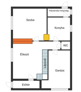 Az alsó szint belső elrendezése : előtér, nappali + étkező, nagy hálószoba, külön wc, konyha + kamra, közlekedő, lépcsőház, garázs