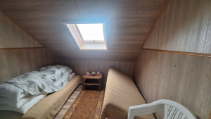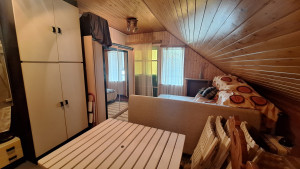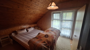 Földszint: nagy társalgó, konyha, hálószoba, fürdőszoba WC-vel