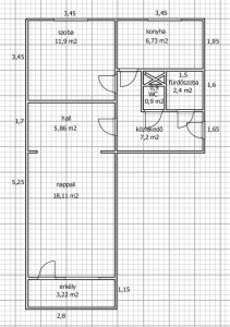 - lakótér: 55 m2-es, elosztása: közlekedő, fürdőszoba, külön wc, nappali + hall, konyha, szoba, erkély