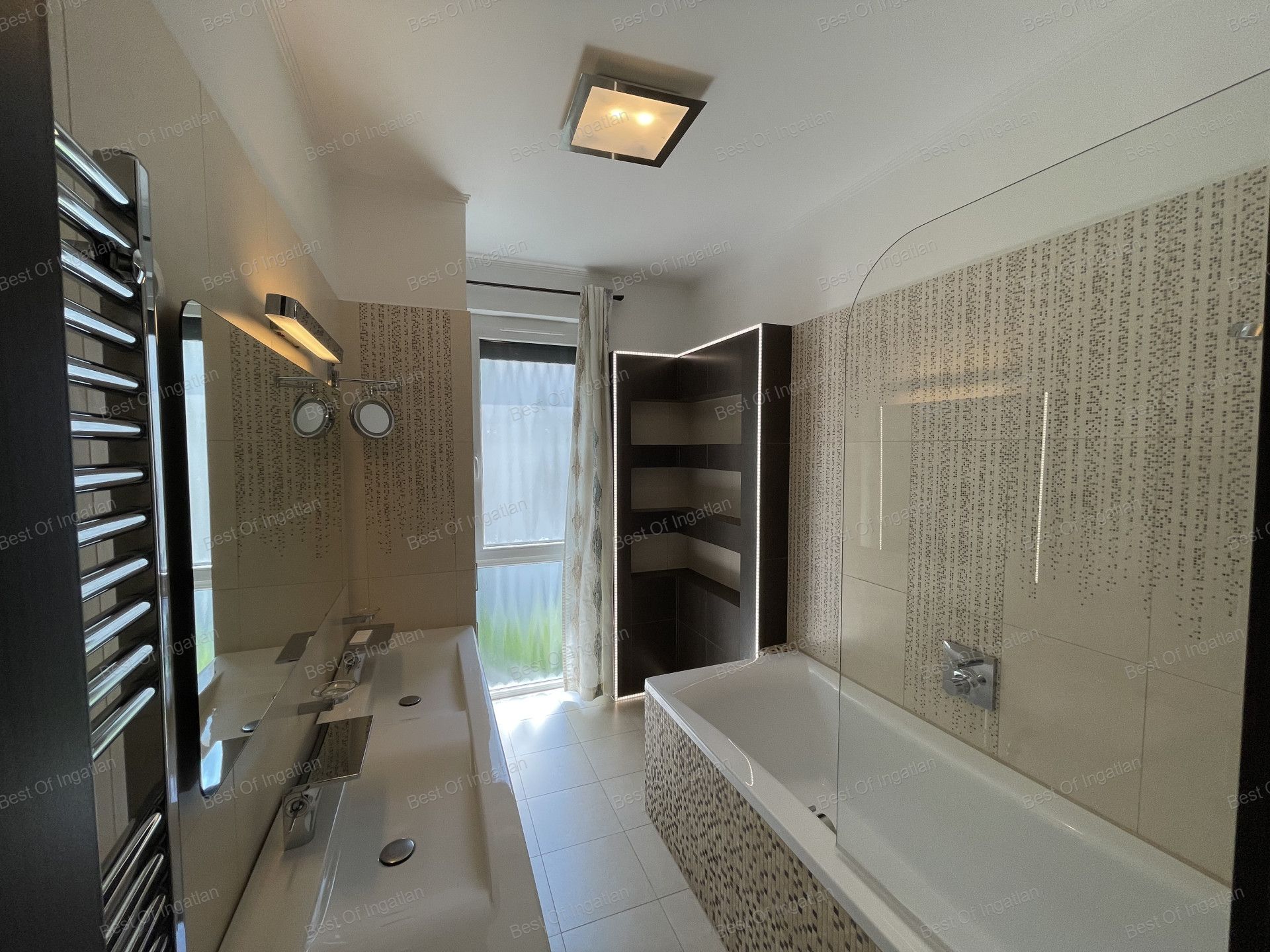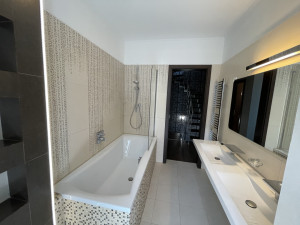 - tágas fürdőszobában fürdőkád, törölközőszárítós radiátor és duplamosdó is helyet kapott