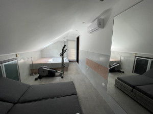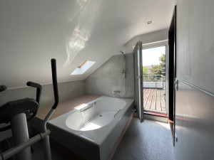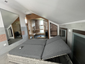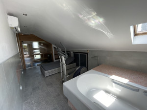 - tetőtérben: tetőterasz, jelenleg wellnes-részként használják, de kis ráfordítással, könnyen egy légterű, fürdőkádas hálószobává alakítható