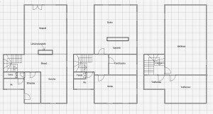 - háromszintes lakás belső elosztása (a jelenlegi nappali + 2 szoba egyszerűen visszaállítható az eredeti alaprajz szerinti nappali + 3 vagy 4 szobássá):
