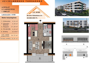A hirdetésben szereplő L3. típusú, 1. emeleti, D-K-i fekvésű, erkélyes lakás 34,73 m2 + 8,26 m2 erkély