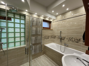 Fürdőszobában zuhanyzó, fürdőkád, duplamosdó és törölközőszárítós radiátor található.