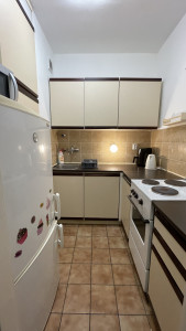 Lakótér: 43  m2, melynek elosztása: közlekedő, egy szoba, mely nappaliként és hálóként is funkcionál, kis konyha, fürdőkádas fürdőszoba, külön WC